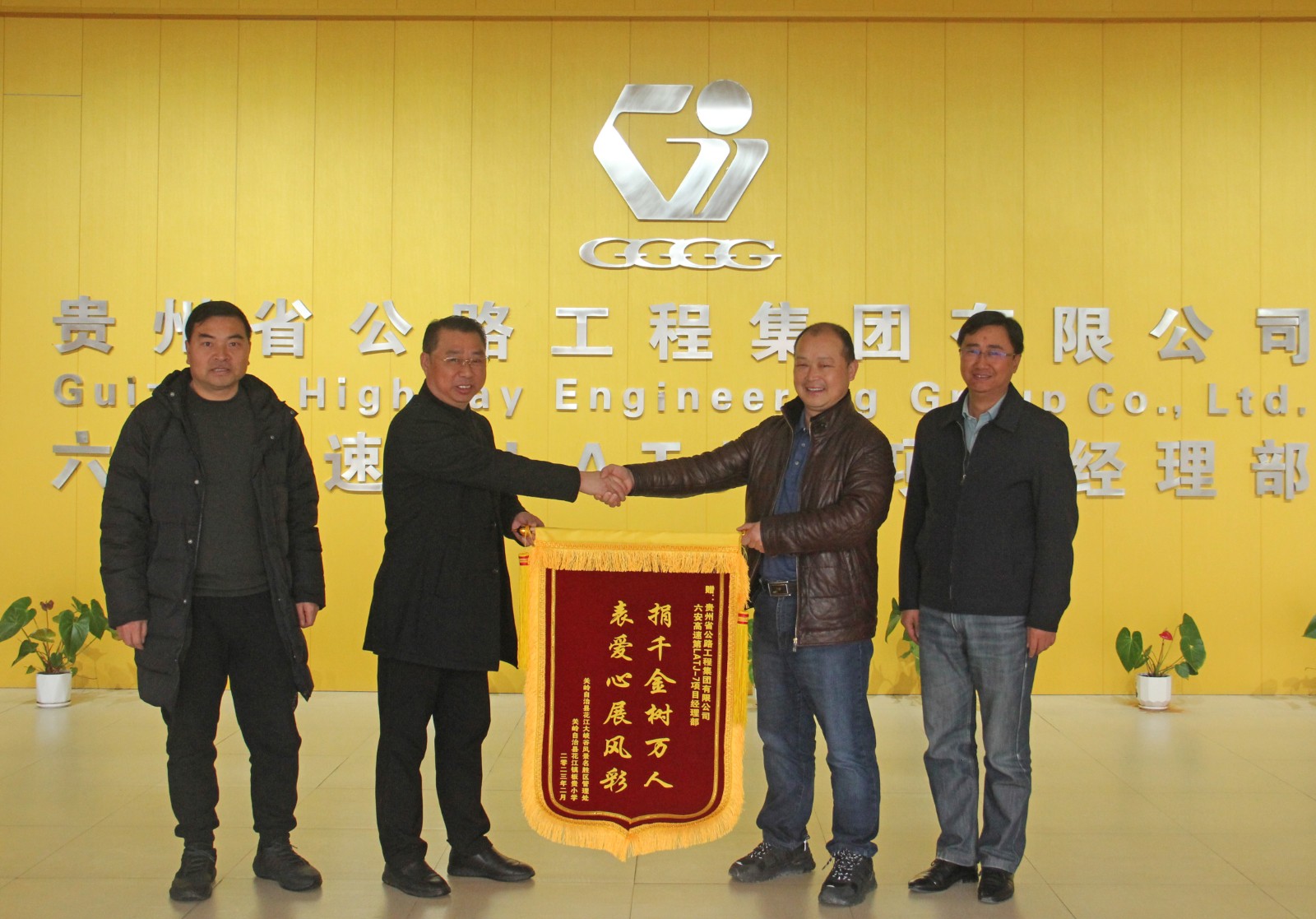日前,关岭县花江镇花江大峡谷景区管理处处长杨昌华、花江镇峡谷村板贵小学校长贺明学将写有“捐千金树万人 表爱心展风彩”的锦旗送到了贵州公路集团第三工程公司六安7标项目经理王朝国手中,对六安7标捐赠2万元助学金及帮助维修电脑设备助学行动表示由衷感谢。