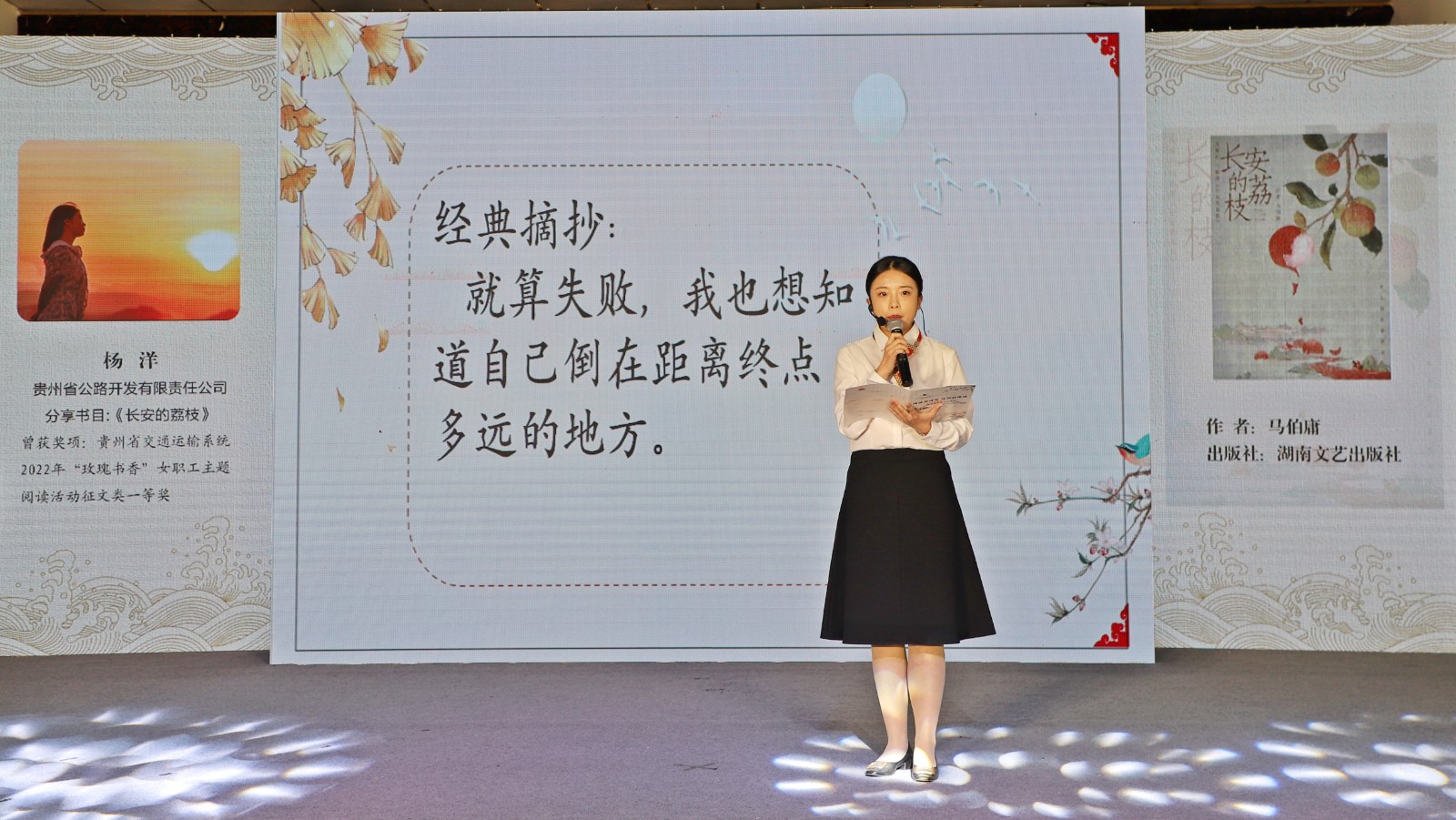 来自贵州交建集团的分享者李美仪在现场为大家分享了胡适的自传体散文——《我的母亲》;在她的分享讲述下,胡适母亲善良、宽容、有刚气的形象特征让人印象深刻,她对儿子的那份朴素的、至纯的爱让人感动不已。