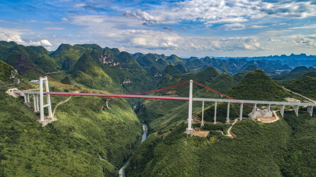峰林大桥横跨马岭河峡谷,是兴义环高的主要控制性工程,也是我国山区首座大跨径钢混结合梁悬索桥。峰林大桥应用了整体横梁预制装配化成套、喀斯特山区陡坡地段桥梁高桩承台等多项科技示范技术,并辐射研发出了独有的分岔隧道连拱段独立双洞法修筑技术。