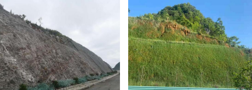 K34段高陡岩质边坡左侧应用植被修复及三联防护技术效果前后对比