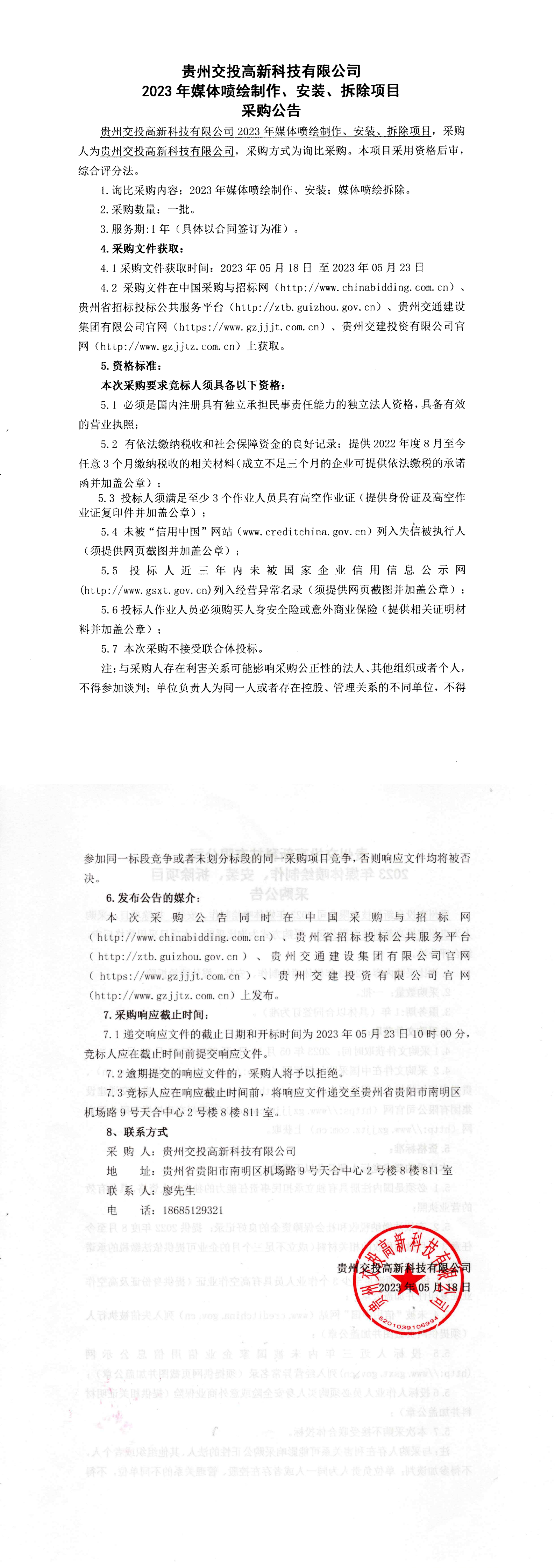 贵州交投高新科技有限公司2023年媒体喷绘制作、安装、拆除项目成交结果公告