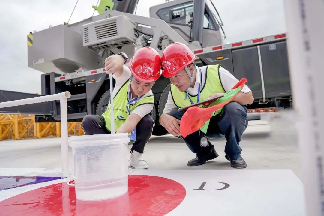 启动、前行、停车、接电,选手们有条不紊、一气呵成。来到吊装区域,伸支腿、起臂、下钩,选手们将装满水的水桶挂上吊车副钩,在水桶离地20-40厘米后沿轨道移动一圈,并尽可能保持平稳。