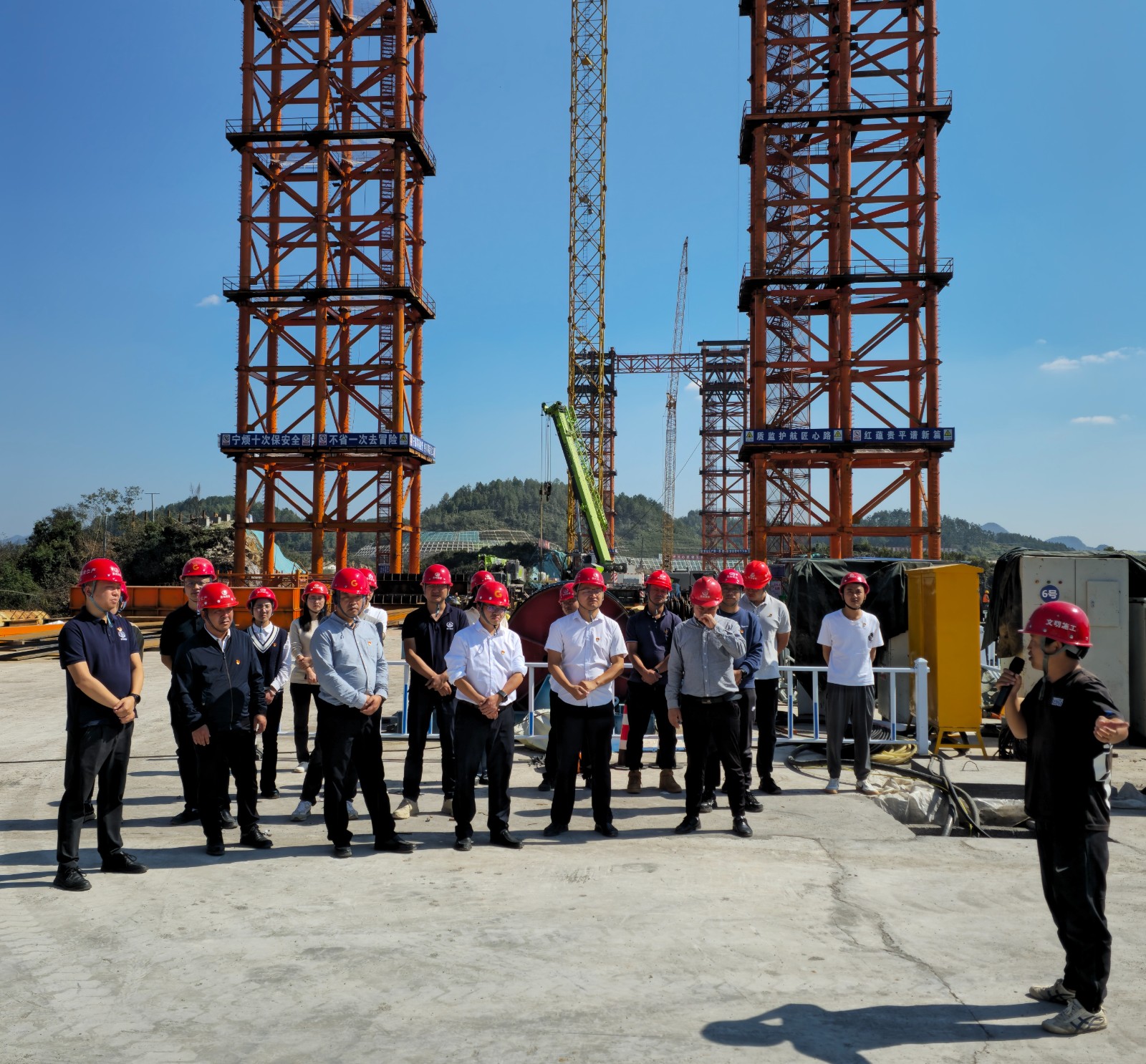 本次活动中,四个工作组先后走进贵平12标智慧梁场、贵平18标拉密河大桥施工现场等地,全面了解项目建设情况,观摩学习创新经验做法、现场解决遇到的难点问题。并通过组织召开座谈会等方式,传达学习了习近平总书记视察贵州重要讲话和对贵州工作重要指示精神、习近平总书记关于交通运输的重要论述精神,宣讲了贵平公司“四新四化强省会•五心五美建贵平”工作规划和“交建先锋•红蕴贵平”党建品牌创建活动方案,逐一解答回应贵平项目各标段存在的困难和问题。
