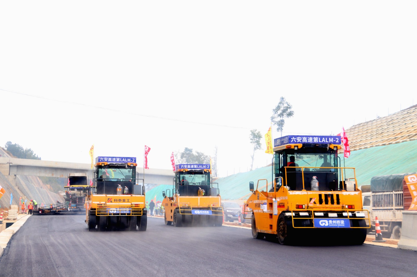 彩旗摇曳,鞭炮声脆,随机器隆隆声响,大通公司六安高速LALM-2首件AC-25C沥青下面层正式开铺,历经8小时奋战,试验段顺利完成摊铺,标志着六安高速路面二标段正式进入沥青路面施工阶段。