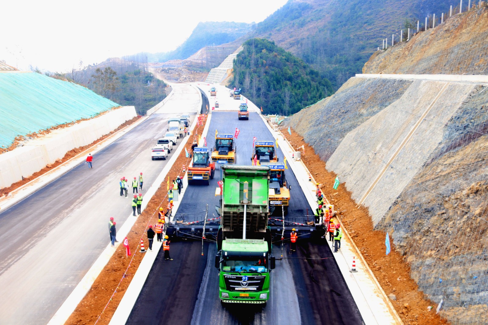 据悉,本次试验段选址为K55+000—K55+600右幅,设计长度600米,宽度12.75米,厚度8厘米,采用了德国进口福格勒Super2100-3摊铺机实现一体化摊铺,投入碾压设备双钢轮压路机3台,胶轮压路机3台碾压成型。