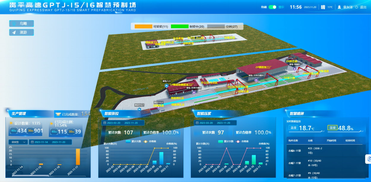 贵平15、16标创新管理思路,加强预制梁板生产智能化、管控智慧化,通过“一块屏”,实现两个标T梁预制场远程统一管控。