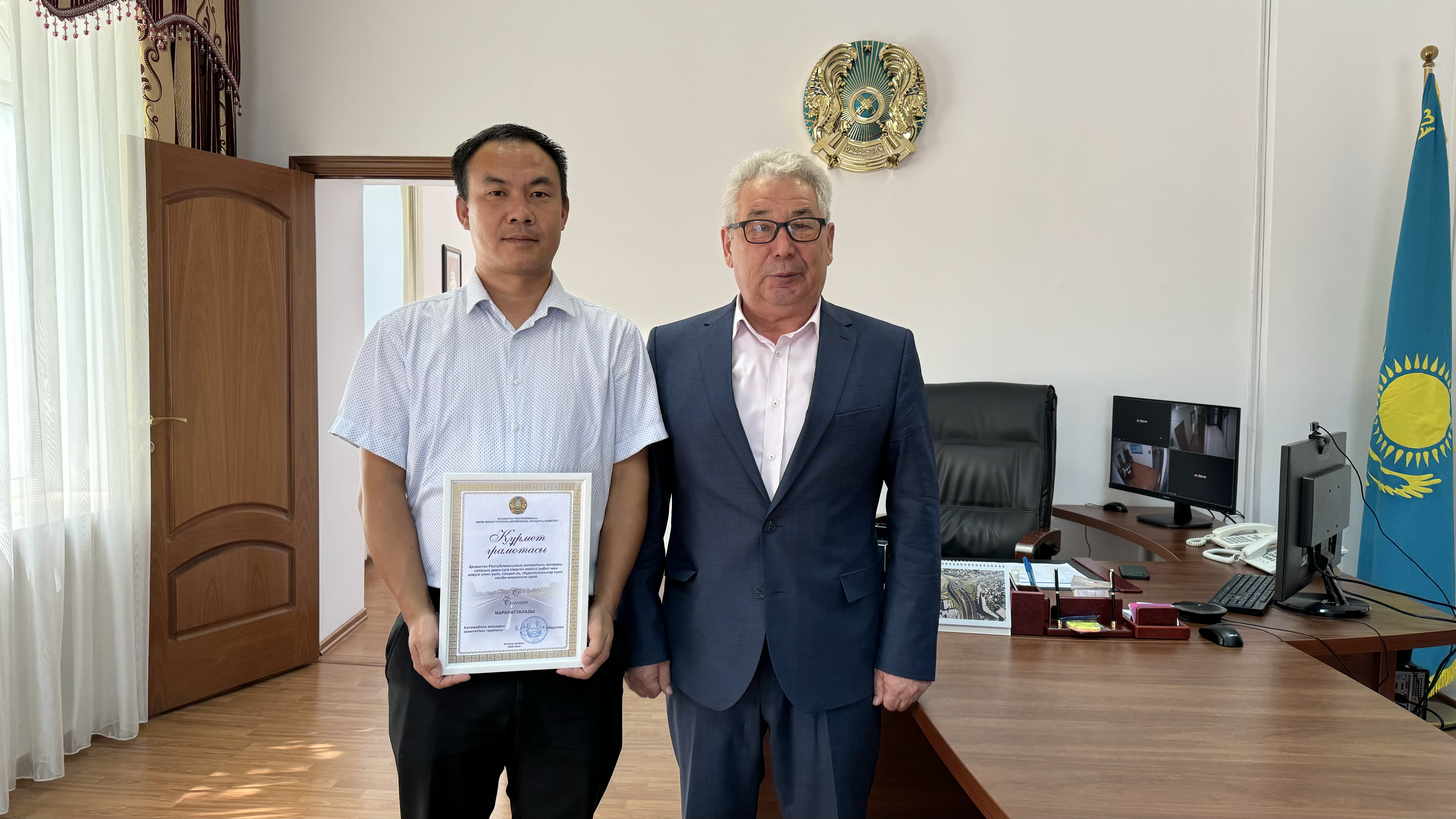 克孜勒奥尔达州公路局局长朱尼索夫(右)为谢兴时颁发荣誉证书