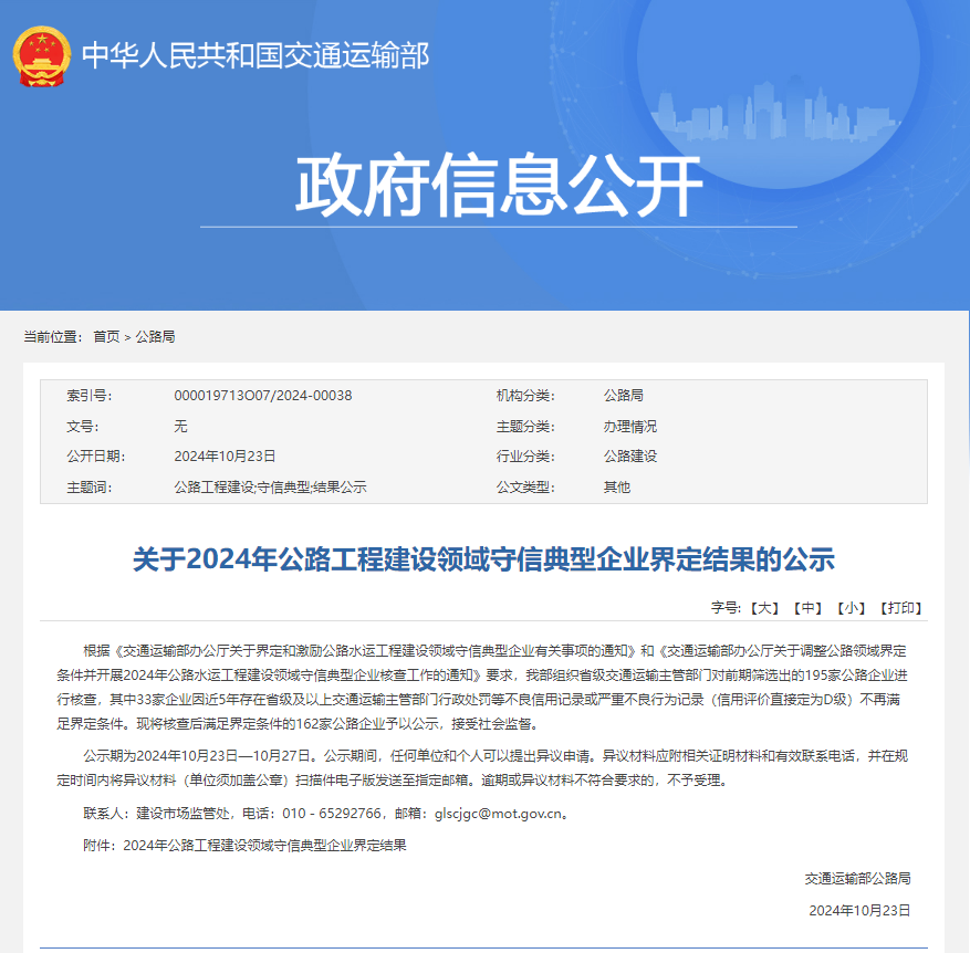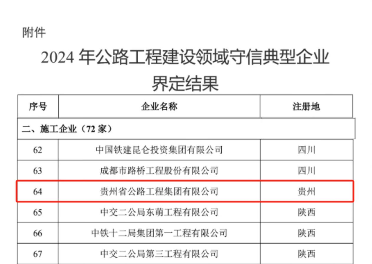 日前,交通运输部公布2024年公路工程建设领域守信典型企业界定结果,贵州交投集团所属公路集团榜上有名,是贵州省今年唯一一家入选的施工企业。