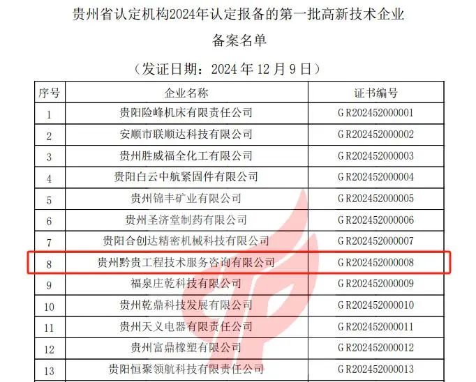 近日,全国高新技术企业认定管理工作领导小组办公室发布《对贵州省认定机构2024年认定报备的第一批高新技术企业进行备案的公告》,贵州黔贵工程技术服务咨询有限公司顺利通过认定。